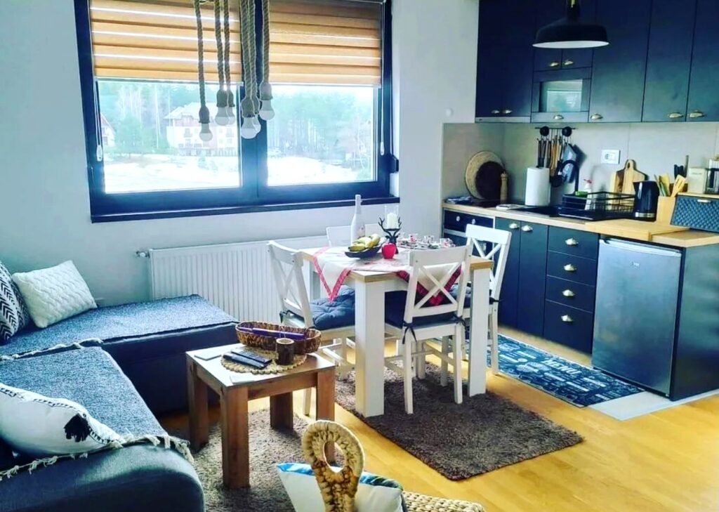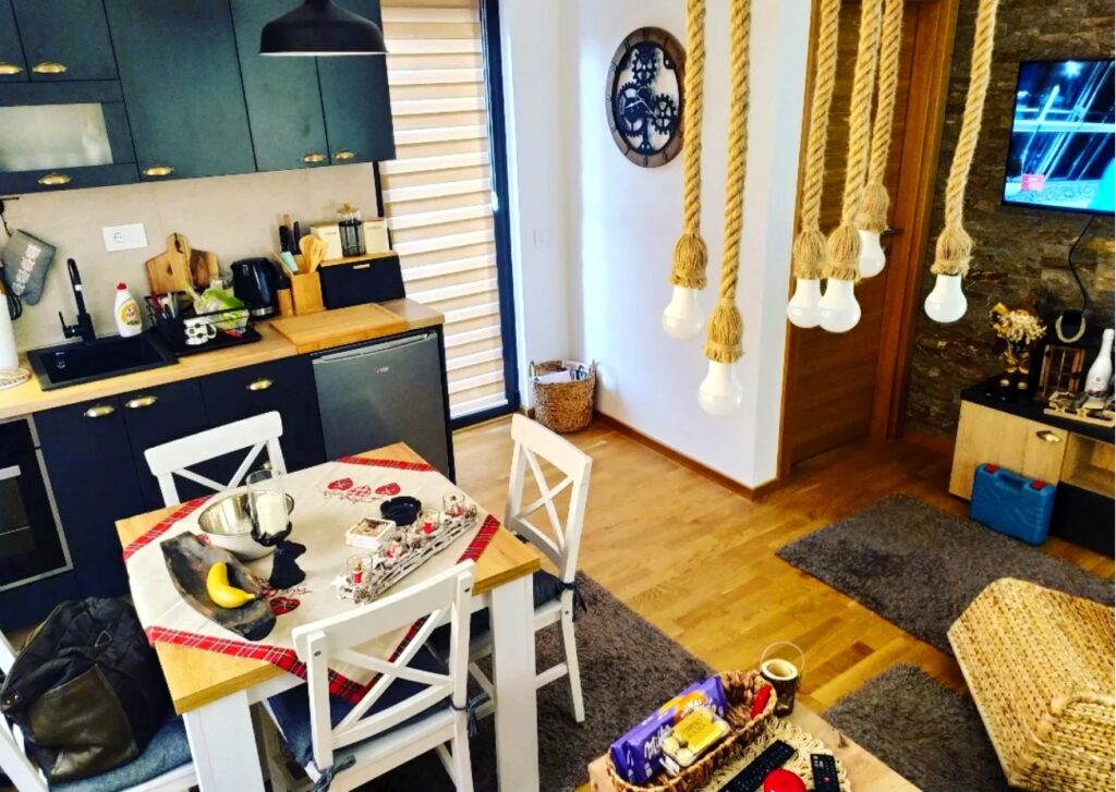 Kuhinja apartmana je potpuno opremljena(šporet sa rernom), posuđe, pribor, frižider.